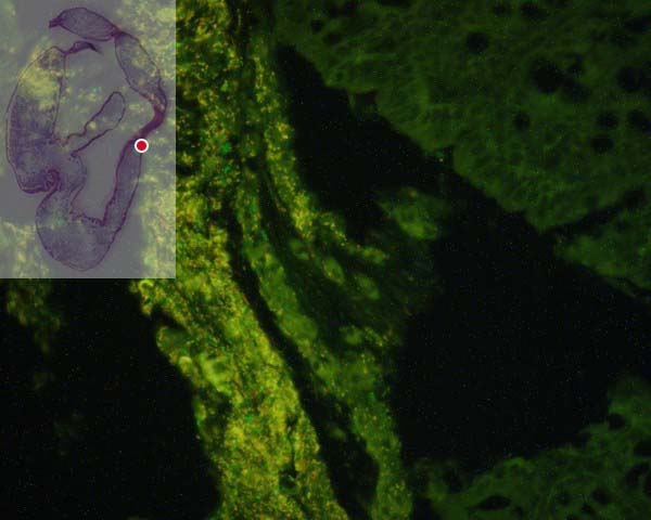 Reihe von FISH-Bildern, die kontinuierlich entlang der Darmwand aufgenommen sind. Mit der Vor- und Rückwärts-Taste wandern sie schrittweise entlang des Darms.  Der rote Punkt auf dem Übersichtsbild markiert die jeweilige Position des mikroskopischen Feldes.  Die Farben sind real mit einer Nikon Digital Kamera aufgenommen. Bacteroides ist Orange (Cy3), Eubacterium rectale leuchtet rot (Cy5), alle anderen Bakterien haben eine grüne Fluoreszenz. DAPI (blaue Fluoreszenz) färbt die Nukleinsäuren. Wahlweise sind alle drei Bakteriengruppen simultan aufgenommen. Zur besseren Übersicht präsentieren einige Felder ausschließlich Cy3 (Bacteroides) oder Dapi (Nukleinsäuren) Fluoreszenz.